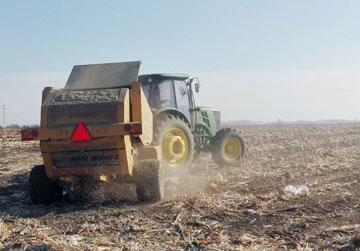 伊通镇红日种植合作社,在安装了机械化精准作业远程电子监测设备后,将玉米收割后留在地里的秸秆打包成捆。机械打包秸秆运走对下一步的土地深松作业,提供了很好的条件,使得深松机下地作业时,减少秸秆过多对深松机作业时产生的障碍。打包运走的秸秆,既可送去电厂发电,又能加工成饲料喂牛,还大大减少了秸秆焚烧给环境带来的污染。